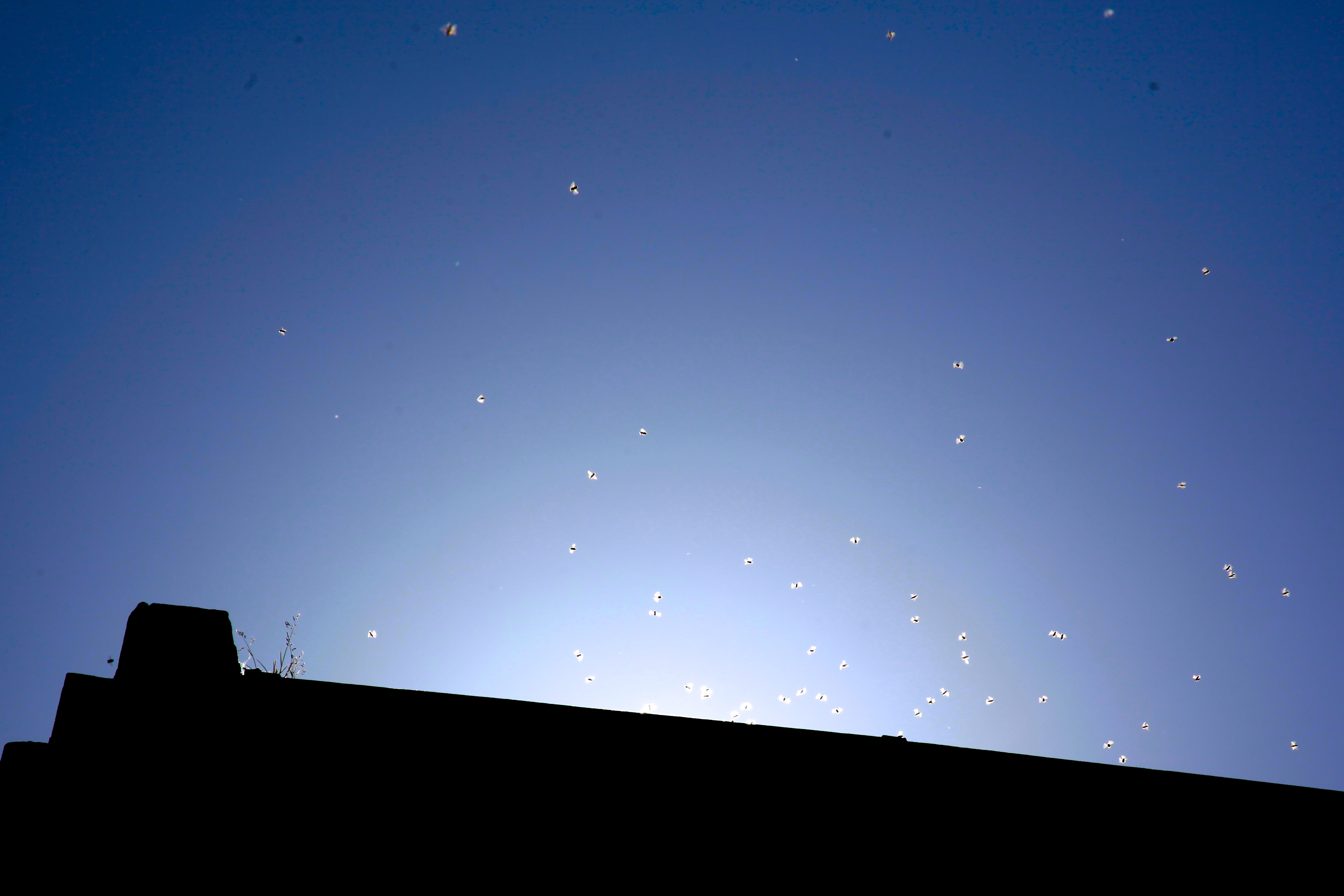 Guests are now here to stay and yesterday when I was putting Gracie down again my friend Louise came running up the stairs; ‘I think you better come and look at this!…’ Outside the kitchen window the mini-swarm on the roof had turned into a massive swarm about 30 feet high and 10 feet across. It quickly reduced in size but the thought of thousands of wasps suddenly appearing out there is not very nice to say the least.