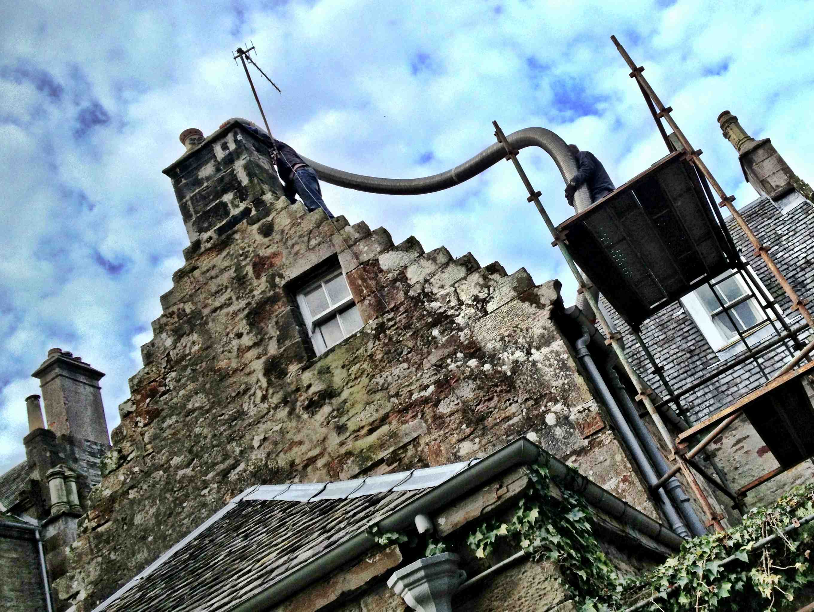 So the pressure is on. The only way we will ever get this boiler in – and the only way we will ever have a warm house is to get a flue liner (another big metal tube) down the current chimney come what may. Only then will the council grant us permission. If the builders can’t get it in I don’t know what we’re going to do. Several men and a load of scaff’ are arriving on Monday…