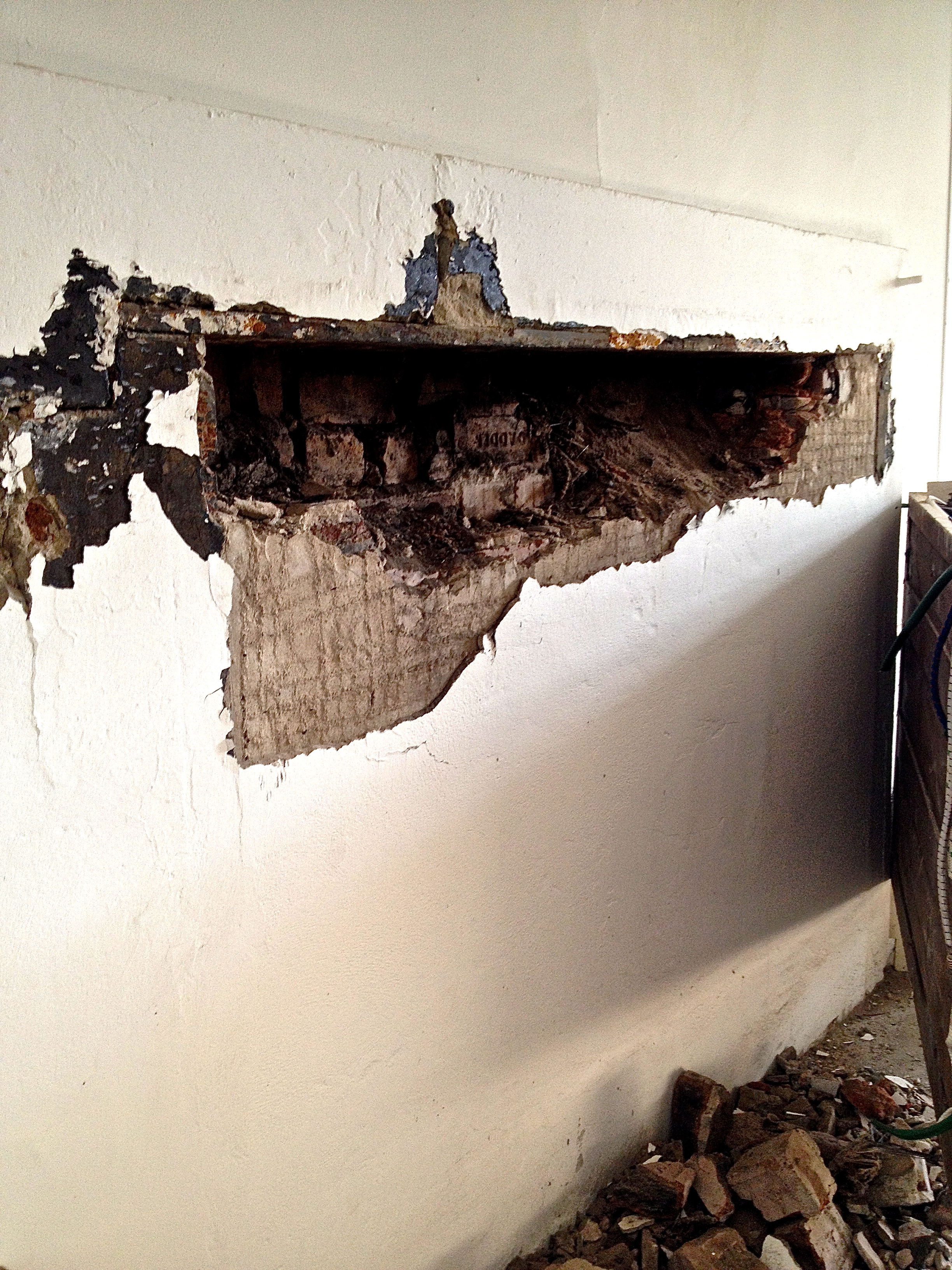 We think there could be an old bread oven on the left as there’s a different section of bricks there. It’s very deep to the back wall – a good few feet, which means we’ll likely be able to build in an inglenook seat as well as putting in a burner. The stone lintel is sitting on what looks like an iron shelf – we’re not sure why… it could be holding up that whole wall!