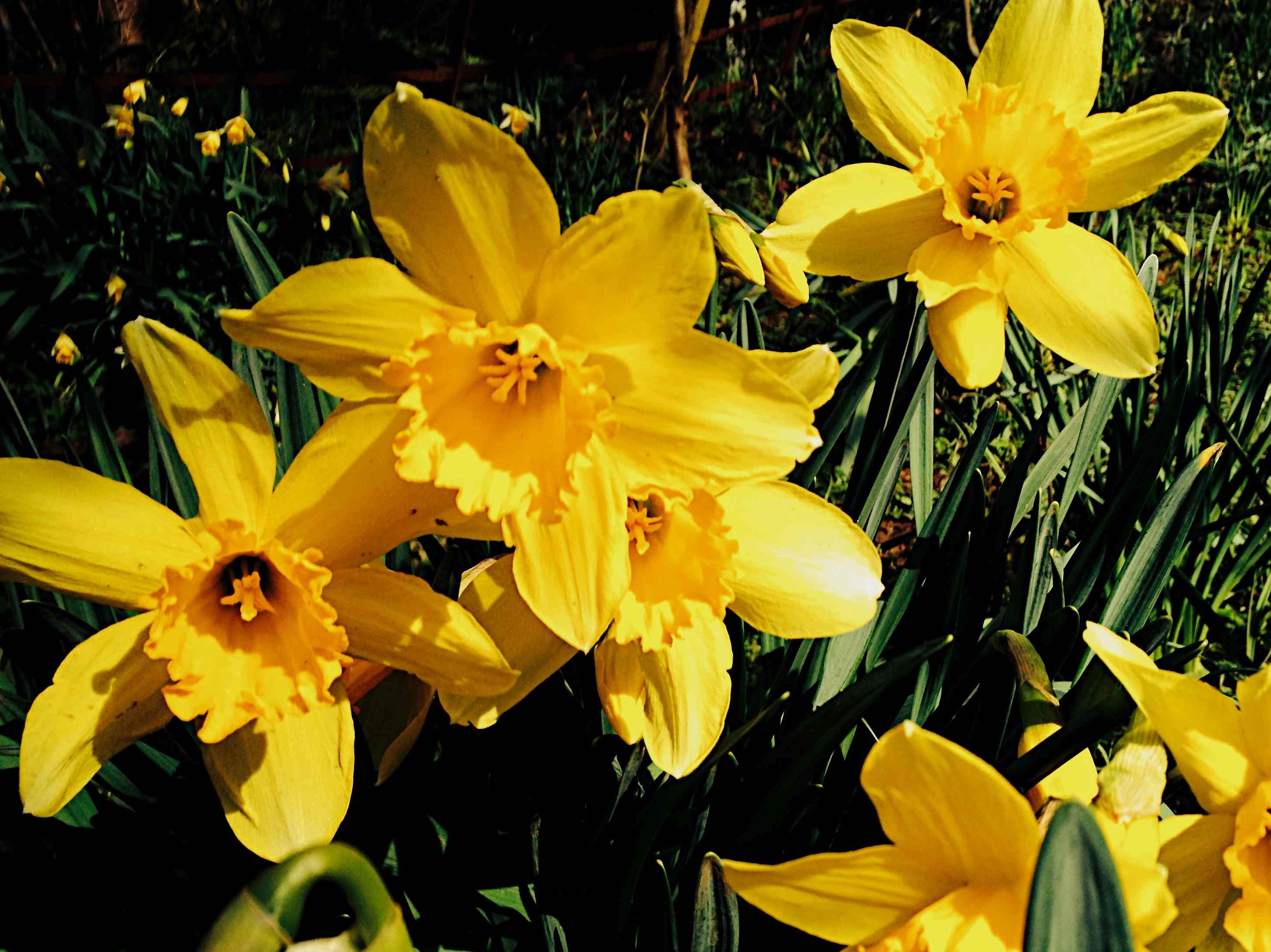 The daffodils are in full bloom and they’re everywhere. Gracie and I collect armfuls for the house and give a big bunch to Neil who’s up here checking the bees.